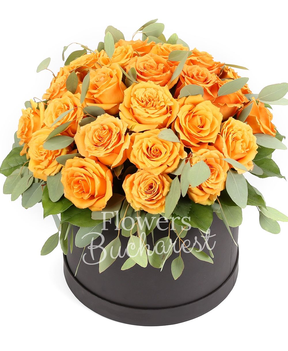 The arrangement of orange roses in a box is a modern and inspired choice when you want to pleasantly surprise her and to show that you are spontaneous, full of energy and enthusiasm. No matter the occasion, the arrangement of orange roses in a box will grab the attention with its intensity and will cause a wave of joy.