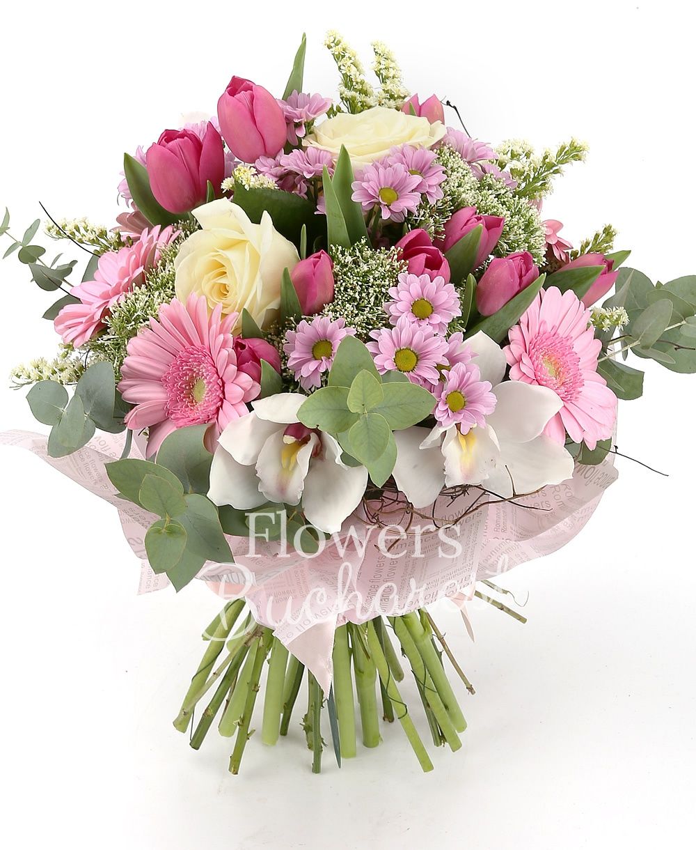 The admiration felt for someone dear will be fully understood when you choose to offer this delicate and graceful bouquet, made with flowers in pink hues. Gerberas represent joy of being with the one you love, while roses and orchids are a sign of sincerity and trust.